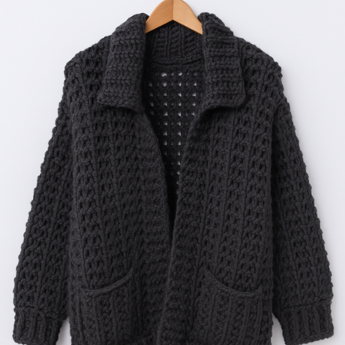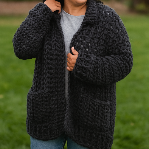 Create your own effortlessly chic, oversized Coastal Cardigan with this easy-to-follow digital crochet pattern. Perfect for beginners and seasoned crocheters alike, this pattern uses a large hook and super bulky yarn for a quick, satisfying project with beautiful drape and structure. The design features relaxed, flowy sleeves, deep pockets, a stylish lapel collar, and a textured hem for a polished finish.