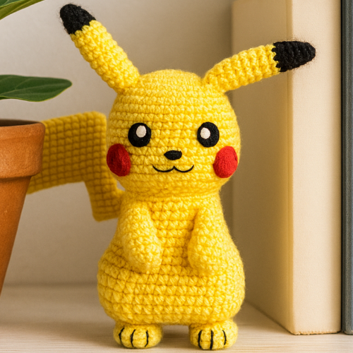 This guide provides instructions for crocheting a Pikachu amigurumi toy. The finished toy will be approximately 9.5 cm tall if crocheted with a single yarn and a 1.00 mm hook. The pattern calls for yellow, brown, black, and red yarn, along with a 1.00 mm and 1.25 mm hook. Other materials needed include a sewing needle, stuffing material, and a piece of plastic. The recommended yarn is “Iris” 100% cotton yarn (). Polyester wadding is suggested for the stuffing material.