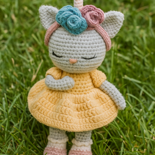 Download this cute kitten crochet pattern PDF to make an adorable amigurumi cat doll with dress, shoes, horn & flowers. Beginner-friendly guide with materials list and detailed steps.