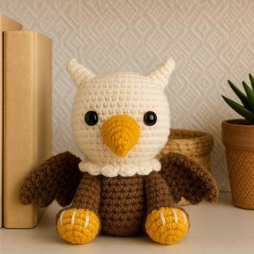 This charming griffin features a detailed head and body, beak, feather tufts, arms, legs, wings, and embroidered talons. The pattern includes full instructions for assembly and finishing touches.